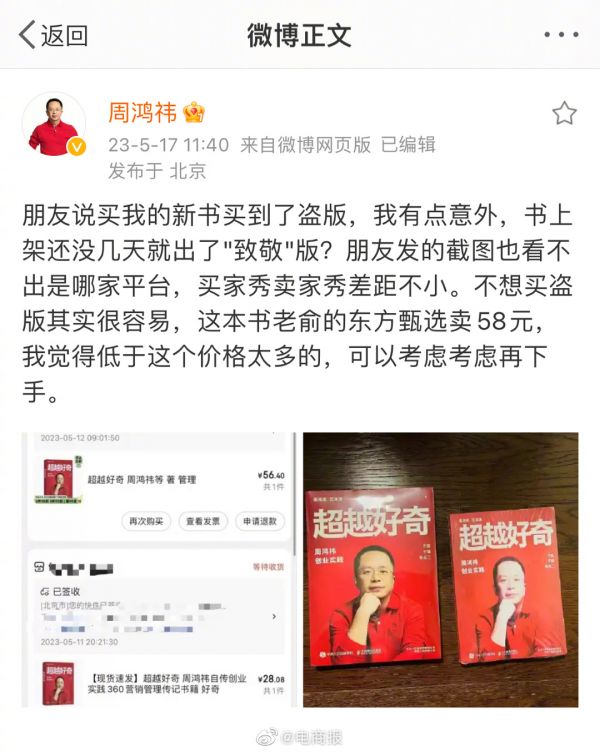 新书刚上架就有盗版了,周鸿祎吐槽卖家秀和买家秀差距不小……