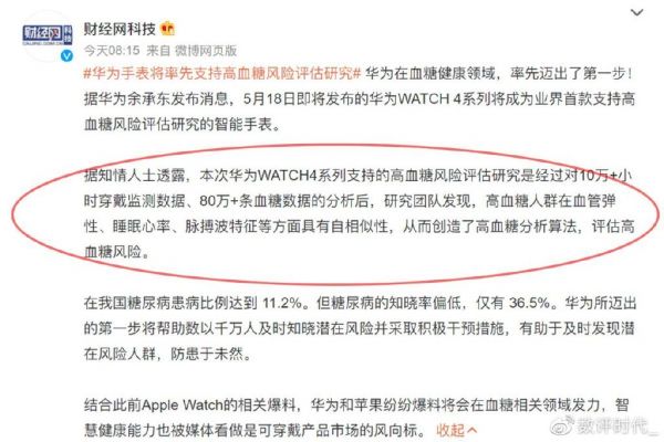 其实从媒体曝光的相关信息来看,华为WATCH4系列也与传统血糖仪产品完全不同。华为采用的是大数据分析法,对超过10万+小时穿戴监测数据以及80万+条血糖数据分析后,找出了高血糖人群在血管弹性、睡眠心率、脉搏特征等方面的规律,进而初步评估佩戴者的高血糖风险等级。