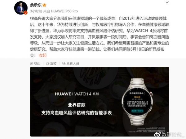 5月15日,余承东发布的一条消息引起了很多人的关注。华为WATCH4系列手表将成为业界首款支持高血糖风险评估研究的智能手表。“这手表能测血糖吗?”是网上最常见的一个问题,包括我们每次介绍智能手表产品时,都会遇到相关提问。而我的回答也非常明确——现在还没有无创测血糖的技术。华为、苹果都在积极探索相关方案,现在来看,还是华为快一点。