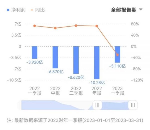 2023年第一季度,Robinhood的营业收入为4.41亿美元,同比增长47%,环比增长16%;净利润为-5.11亿美元,而去年同期为-3.92亿美元,已连续第七个季度亏损。