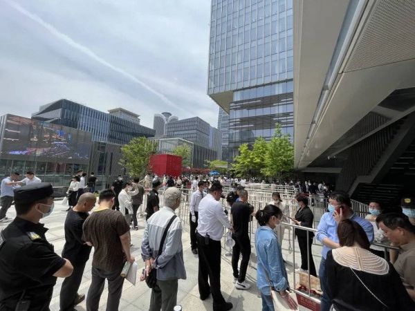5月16日中午,云锦东方进入认筹的最后一天,据《每日经济新闻》记者观察,认购现场人头攒动,入场通道上,购房者们顶着烈日排队等候,一位安保人员提着扩音器向人群中喊话,提醒即将关闭通道,正式结束认购活动。
