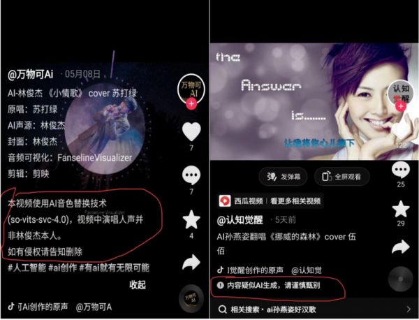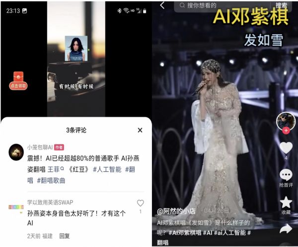 从左至右:快手上的“AI孙燕姿”与抖音上的“AI邓紫棋”