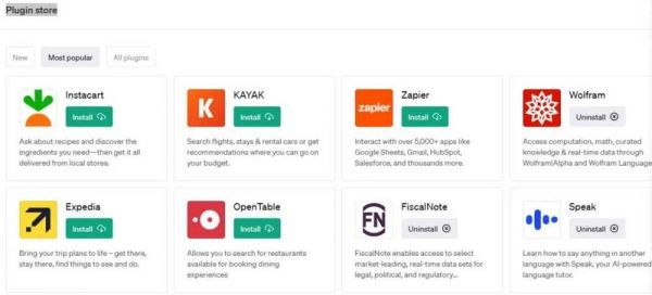 例如WebPilot(网页阅读)、Speak(专业翻译)、Prompt Perfect(提示词润色)、Show Me(流程图)、Wolfram(数学计算)、AskYourPDF(PDF阅读)、CreatiCode Scratch(少儿编程)、Chess(国际象棋游戏教练)、edX(公开课学习)、FiscalNote(政策咨询)等等。