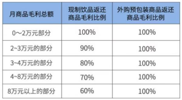 瑞幸向联营商收取的服务费用也更高。门店月毛利超三万元后,瑞幸抽成比例较库迪梯次增加5%~15%不等。最高一档8万元以上毛利,库迪抽取25%,瑞幸抽取40%(官方图中显示返还60%)。