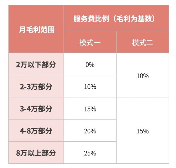 同样的,库迪的联营商也是零加盟费,给总部分成。根据招商资料,按不同梯度的月毛利,上缴不同比例的服务费,赚得越多,缴纳的比例越大。