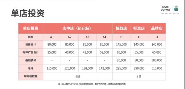 根据库迪咖啡的招商宣传资料,库迪对单店投资额(包括设备、柜体广告、基础装修)的预估在11.5万元~51万元之间,按照规模大小分为店中店、快取店、标准店、品牌店四类,所需费用依次递增。