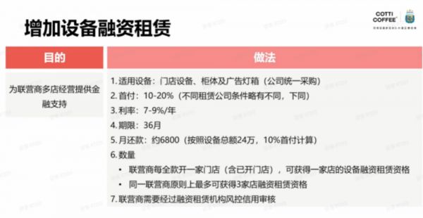 为了鼓励联营商多开店,库迪为开第二家店及以上的联营商提供一定的资金支持,联营商向总部采购设备,首付10%~20%不等,每年付7%~9%的利息。为了把控风险,库迪规定,同一联营商向总部融资开的门店不能超过三家。