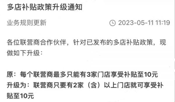 但是,“财经十一人”观察到,低价促销可以迅速拓展市场,但是长期执行则联营商不堪重负。因此,库迪3月底以来多次发布、更改补贴政策。目前,拥有一家店的联营商,每一杯咖啡的实收金额如果低于9.5元,库迪都将以9.5元的金额与之结算;对于拥有两家及以上门店的联营商,价格线提高到10元。这也间接鼓励联营商多开店,多拿补贴。