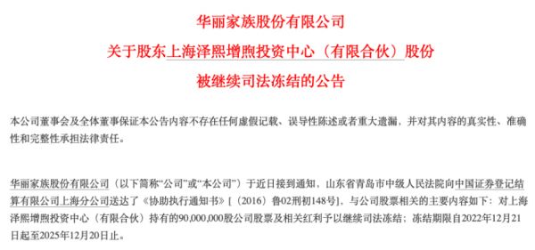 事实上,泽熙投资的股权仍处于冻结期限内。华丽家族最新相关公告显示,泽熙投资冻结期限自2022年12月21日起至2025年12月20日。