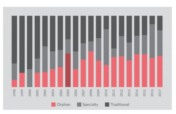 这意味着,制造商以更高的价格抵消了孤儿药市场狭小的弊端。从2008年到2018年,孤儿药的上市价格是非孤儿药价格的7倍。从1998年到2017年,孤儿药的平均价格增长了26倍,而特殊药和传统药的价格仅翻了一番。孤儿药也在以前所未有的速度获得批准并进入市场。在新上市的药物中,孤儿药的份额在1998-2017年的20年间增加了4倍多,从10%增加到44%(图1)。