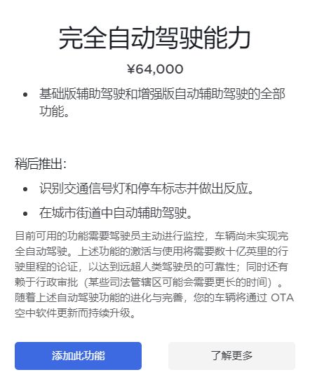 以特斯拉为例,消费者在购买国产版Model 3时,加装“增强版自动辅助驾驶功能”需要多付3.2万元,加装“完全自动驾驶功能”则需要多付6.4万元。而在去年第四季度,仅“完全自动驾驶选装包”就给特斯拉贡献了3.24亿美元的收入。