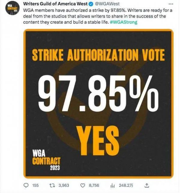 “如果我们现在不努力,三年后就没有什么可争取的了。”WGA的成员、编剧Jacqmin说:“我会用‘绝望’这个词。”4月中旬,WGA进行投票时,决定性的97.85%的人赞成罢工。