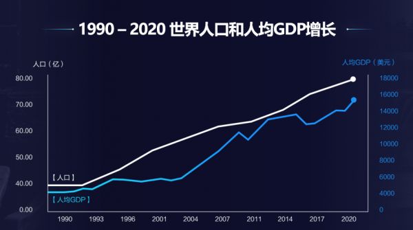 回看过往历史数据,世界人口及人均GDP的大幅增长均出现在三次科技革命时期。始于19世纪中叶的机械革命,带来世界人口及人均GDP的第一次快速增长;到了1900年-1990年的电气时代,人均GDP在60年内翻了3.2倍;1990年以来的信息革命,人均GDP仅30年就翻了2.8倍,增速越来越快。