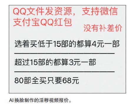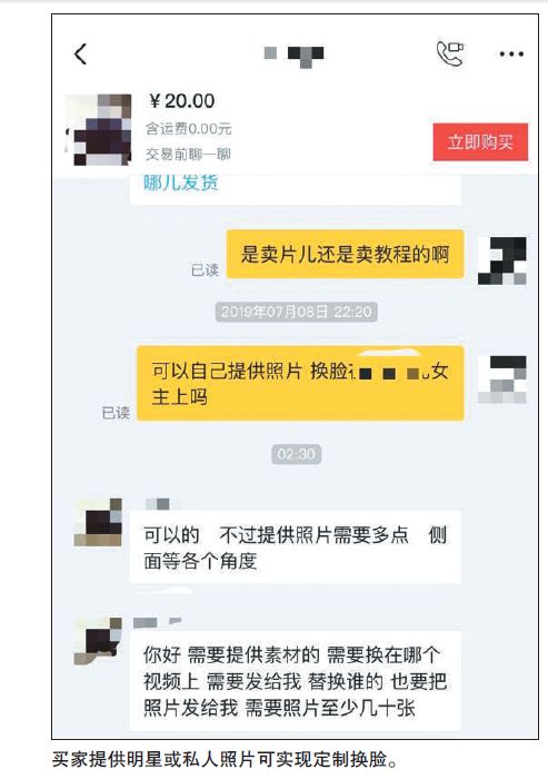 买家提供明星或私人照片,卖家即可将淫秽视频中的主角“移花接木”。定制换脸视频1分钟20元-50元不等。
