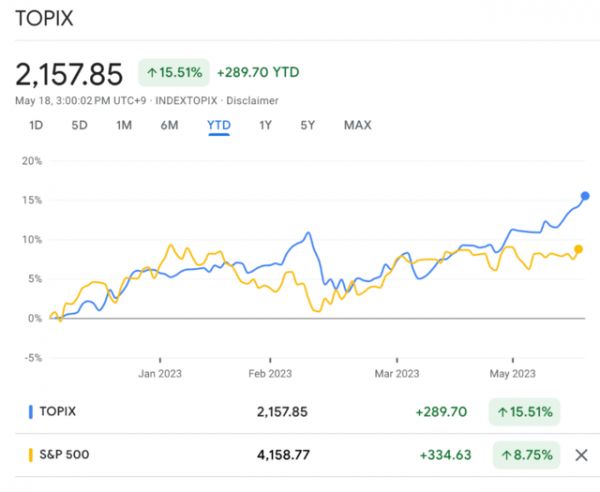 今年以来,东证指数累计上涨15.51%,超过了标普500指数8.75%的涨幅。
