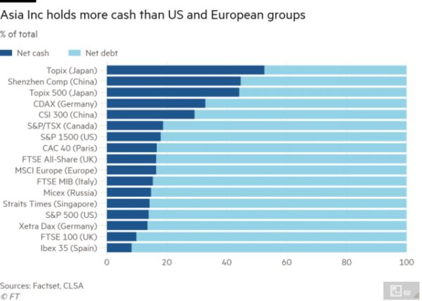 Rosenberg表示,在日本最大的上市公司中有近一半的企业持有的现金头寸超过债务,在美国和欧洲只有不到20%的公司拥有净现金头寸。