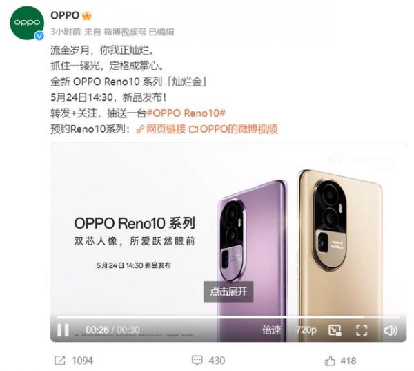 现在官方官宣了将于24日发布OPPO Reno系列的十代里程碑之作——OPPO Reno10系列手机。