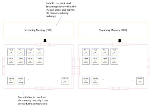与GPU的存储架构中直接连接动态随机存储器(DRAM)相比,处理器的内存由IPU的本地静态随机存储器(SRAM)组成,每个内核(tile)都执行只在本地内存上进行的计算。[5]