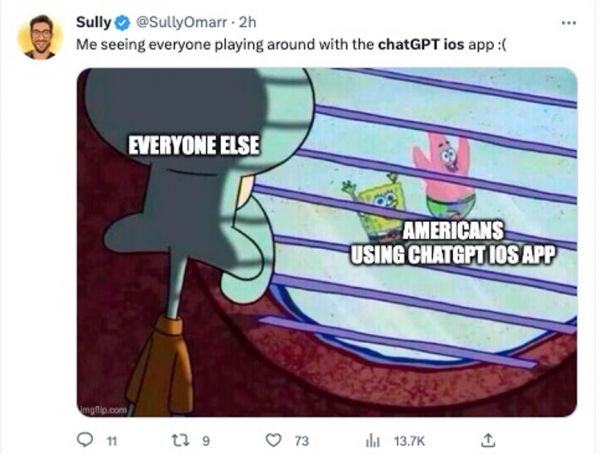 当然,目前更多的人还是跟下面这位网友感同身受:看着美国用户们各种花式秀出在手机上跟ChatGPT的聊天记录,OpenAI什么时候才能开放全球其他国家的下载权限?