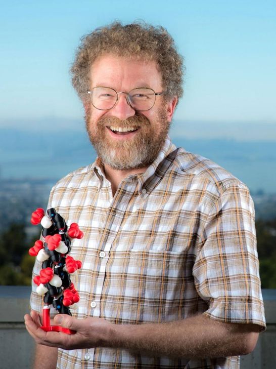 图3 劳伦斯伯克利国家实验室的化学家罗纳德·祖克曼(Ronald Zuckermann)拿着他使用称为peptoids(类肽)的人造聚合物形成的一种蛋白质样结构的模型。他现在正在使用拟肽来检验新的生命起源假说的预测。