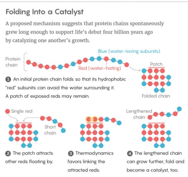 科学家在关于地球生命起源的推测中,通常更加支持“RNA世界”假说(在DNA及其编码的蛋白质进化之前,第一个生物体是基于RNA链的),“蛋白质世界”假说的地位往往排在“RNA世界”之后。然而,一个新的计算模型阐述了早期蛋白质在足够长的时间如何折叠成有用的形状的过程。如果这个模型被验证为正确的话,那么这可能会恢复蛋白质作为生物起源分子的声誉。