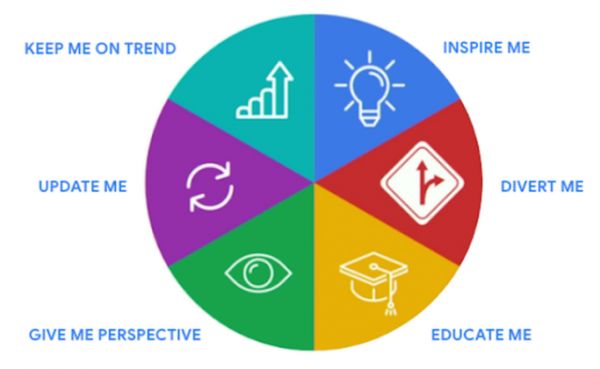 这个初始模型主要关注以下六个用户需求:让我保持更新(Update me)、让我受到教育和启迪(Educate me)、转移我的注意力(Divert me)、给我观点(Give me perspective)、使我紧跟潮流(Keep me on trend)、激励我(Inspire me)。
