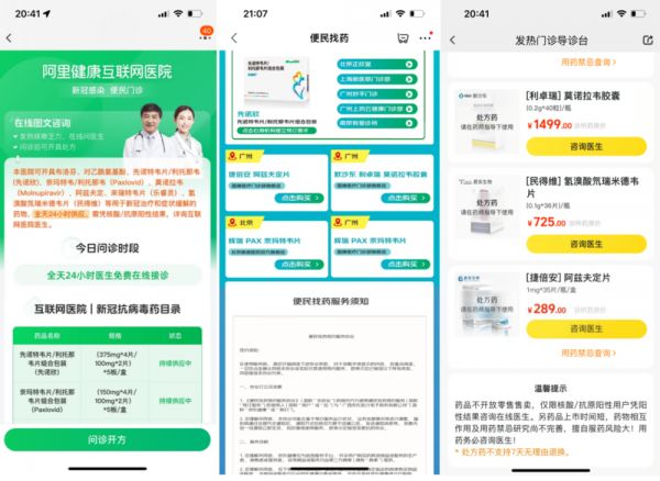 其中,淘宝相关页面提示,上述药物全天24小时供应,需凭核酸/抗原阳性结果,详询互联网医院医生。美团相关页面也提示称,药品不开放零售售卖,仅限核算/抗原阳性用户凭阳性结果咨询在线医生,并强调“药品上市时间短,药物相互作用及用药禁忌研究尚不完善,擅自服药风险大,用药务必咨询医生”。