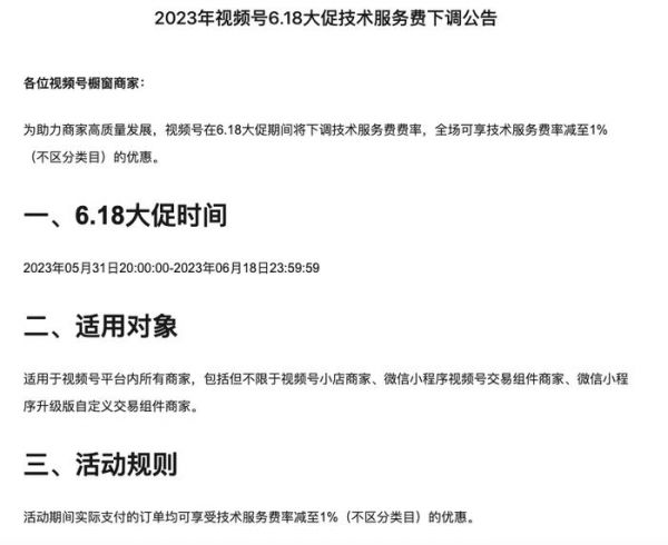 除此之外,技术服务费下调公告的发布,也成为了视频号参战618大促的信号。