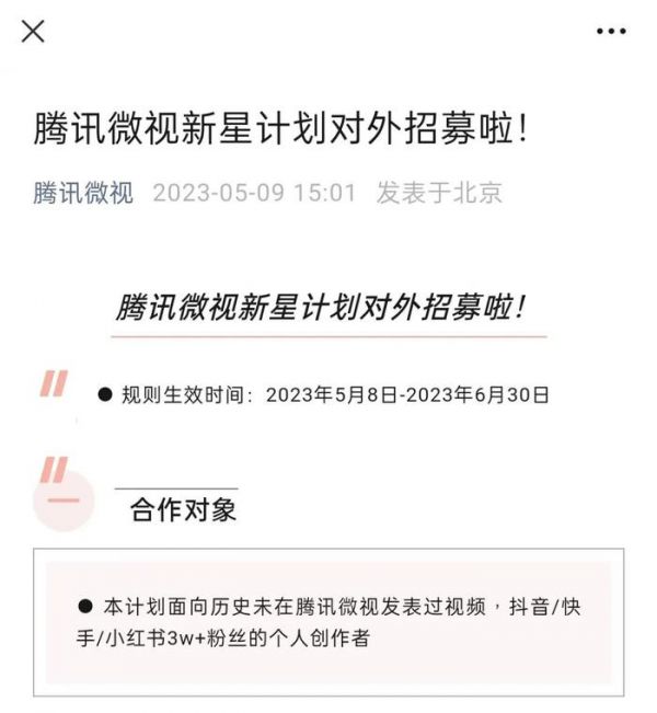 同样是在5月9日,腾讯微视公布新星计划,对外招募创作者。该计划明确指出,招募的创作者历史未在腾讯微视发表过视频,且抖音/快手/小红书粉丝数达到3万以上。