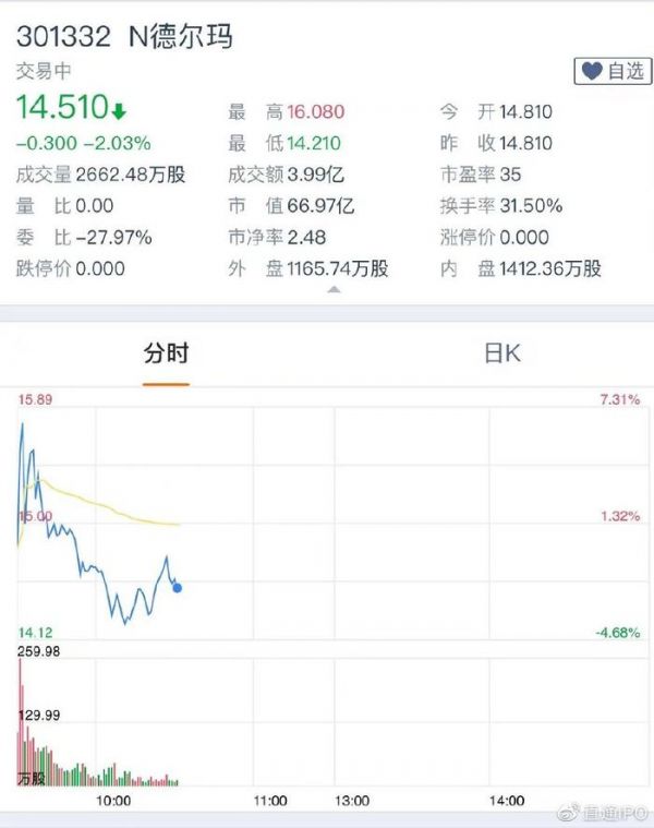 5月18日,广东德尔玛科技股份有限公司(简称“德尔玛”)成功登陆深交所创业板,开盘价为14.81元/股,与发行价持平,开盘后呈现上涨趋势,但随后回落。截至上午10:30分,德尔玛股价为14.51元/股,较开盘价下跌2.03%,市值为66.97亿元。