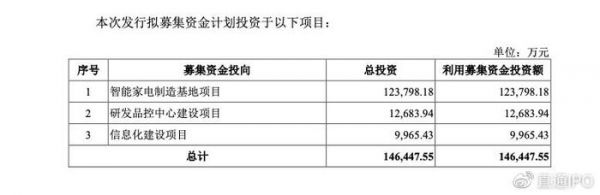 招股书显示,此次募集资金将全部用于公司主营业务相关的项目建设,以提高公司智能家电制造能力、研发品控能力和信息化能力,不断增强公司的核心竞争力。