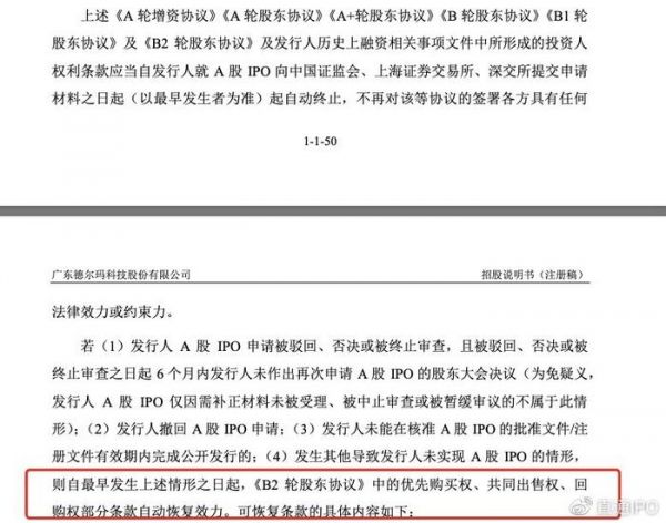 同时,针对《B2轮股东协议》中的优先购买权、共同出售权、回购权部分条款,德尔玛单独给出了“自动恢复效力”的特殊优待。相当于给天津金米和董海峰开了“稳赚不赔”的后门。