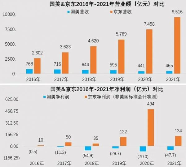 曾几何时,国美还能傲视京东——2010年,京东年营收在102亿元,国美409亿元,京东亏损8亿,国美盈利20个亿,国美占上风。