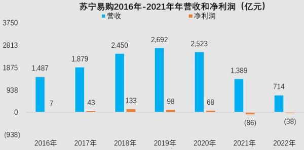 年营收从2016年的1487亿到2019年顶峰时2692亿,再到2022年的714亿,它的业绩数据就像过山车,盈利也从7亿到133亿再到2022年亏损38亿。