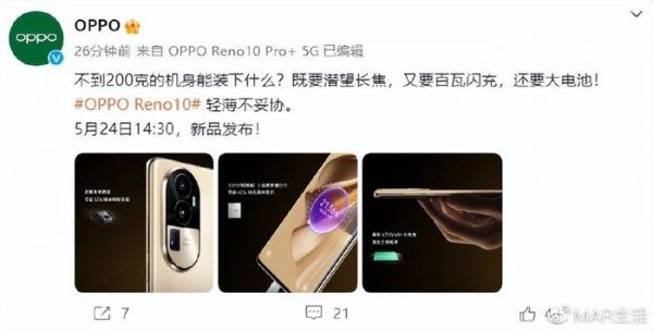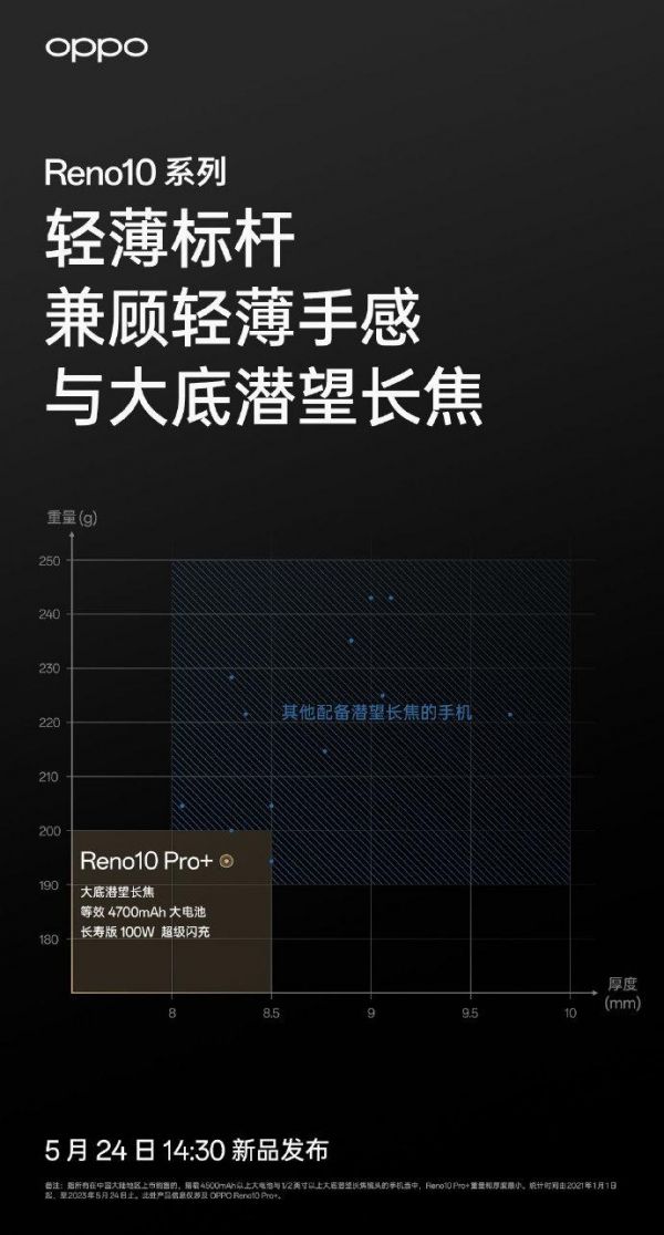 但是在以上发布会里面,在618这段时间前最值得关注的无疑是OPPO Reno10系列和荣耀 90系列的新机发布会。目前OPPO已经在线爆料了不少信息,例如最新公布的Reno10系列轻薄海报,看来是延续了一贯的设计风格,轻薄机身+强大影像,4700毫安时的大电池+长寿版100W超级闪充,Reno10 Pro+可以有效缓解续航焦虑,尤其看到影像方面,大底潜望长焦更是将影像能力提升了一个层级,但具体怎么样,还得看看镜头模组。