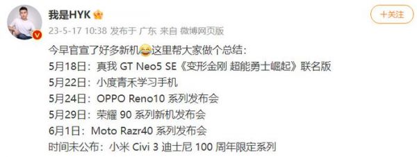 五月的手机市场好热闹,毕竟都想趁着618之前发布新机,配合活动将销量提上来,所以发布会安排的密密麻麻,新机潮是一波接一波。据微博数码大V爆料,18号之后应该还会有5场发布会,每个发布会之间的间隔不超过一个星期,接下来数码爱好者有福了!