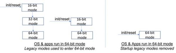 CPU (SIPI) 启动时处于实地址模式,但这里需要一个 64 位的替代方案;而直接处于 64 位复位状态则可以绕过多个跳板代码阶段直接进入 64 位操作状态。