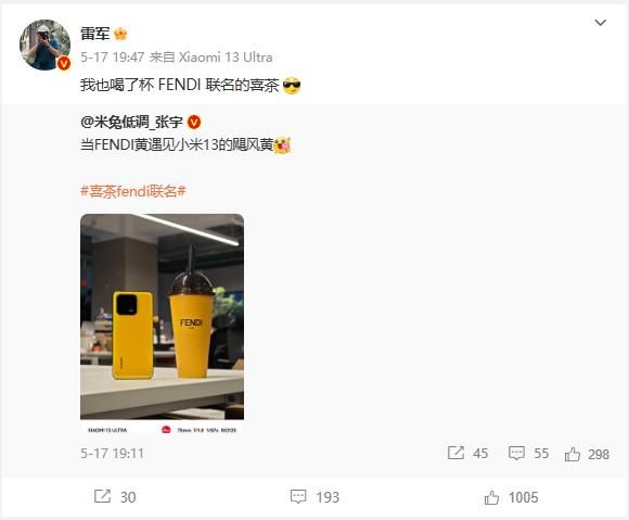 热度之下,小米也借势营销。Redmi手机市场经理张宇发微博,把喜茶Fendi联名款与颜色相同的小米手机放在一起,雷军转发并说自己也喝了杯Fendi联名的喜茶。