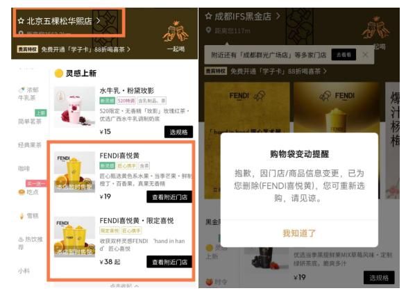 5月17日,印有巨大Fendi(芬迪)和喜茶logo的“FENDI喜悦黄”联名饮品问世,仅仅3天时间,就赚足了目光和话题,喜茶大概也未曾料想到此番会如此火爆。5月19日12时许,《每日经济新闻》记者发现,北京、上海、成都等多个城市热门商圈的喜茶店部分停止售卖“FENDI喜悦黄”。