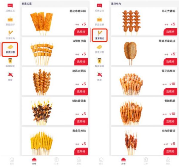 当打开喜姐炸串小程序点单界面,可以看到该品牌产品大多为肉制品,其中的“素素如意”也并不是大众以为的“素菜”,而是年糕、面筋此类为预制速冻的非肉类制品。