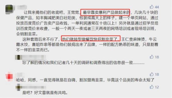 图源:网络此外,在某公众号评论中,有读者爆料王宽宽最初起家是靠百度竞价贩卖暴利的保健产品,再通过此种获利方式来开设培训班,然后再转型做餐饮。