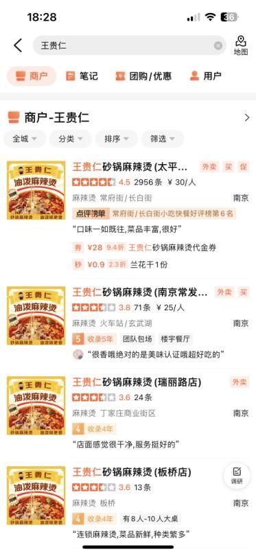 2017年王贵仁砂锅麻辣烫开放加盟,号称裂变1000多家门店。但在大众点评搜索“王仁贵”发现,即使在首发地南京,其门店数量也仅为13家。