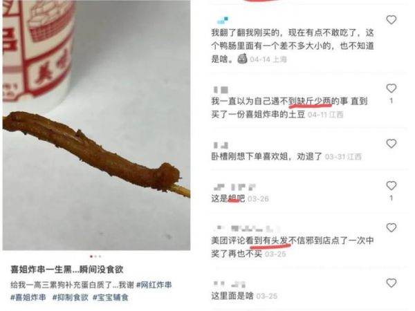 某位小红书网友发帖表示自己在喜姐炸串上吃出疑似虫子的不明物体,帖子下面也有不少网友回复在喜姐炸串曾吃到头发、遇到缺斤少两等问题。