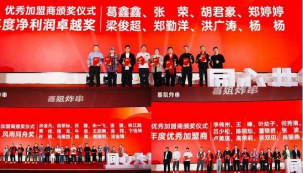喜姐炸串官网中,“千人年会”的宣传报道不断强调加盟商通过喜姐成功年入百万,称搭上餐饮资本红利快车,便能实现财富和阶级跃升。