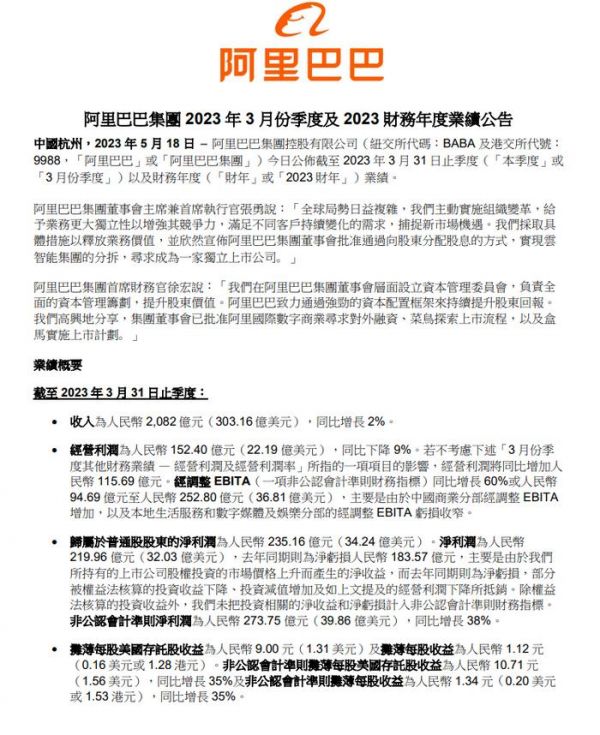 5月18日,阿里巴巴集团公布了截至2023年3月31日的2023财年第四季度及全年业绩。