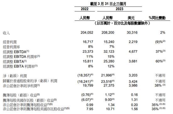 财报显示,该公司第四季度营收为2082亿元(约合303.16亿美元),同比增长2%;净利润为219.96亿元(约合32.03亿美元),而去年同期净亏损183.57亿元。不按美国通用会计准则(Non-GAAP),净利润为273.75亿元(约合39.86亿美元),同比增长38%。