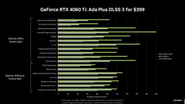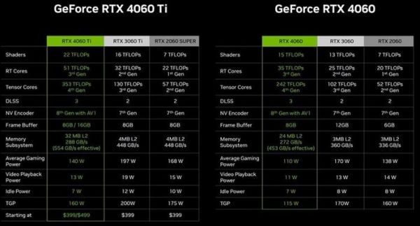 性能上来说,官方表示相比较RTX 3060 Ti性能提升幅度为15%,与RTX 2060 SUPER相比提升60%,当然RTX 4060 Ti的绝招是DLSS 3,在DLSS 3的加持下,RTX 4060 Ti相比较RTX 3060 Ti和RTX 2060 SUPER性能提升幅度分别达到了70%乃至于160%,十分地恐怖。最后是大家十分关心的价格,英伟达称RTX 4060售价2399元,RTX 4060 Ti 8GB售价3199元,而RTX 4060 Ti 16GB售价3899元,RTX 4060 Ti的售价比之前的RTX 3060 Ti更为昂贵,大概率是因为汇率的缘故。