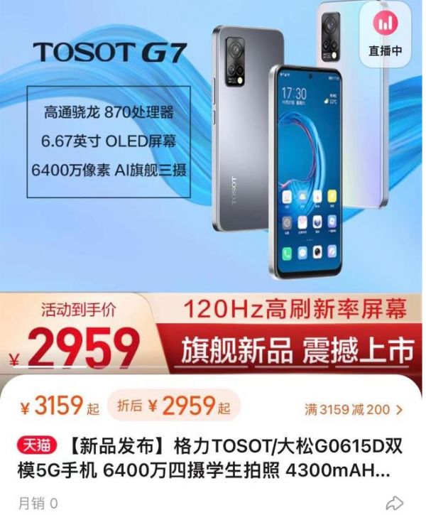 从2015年至今,格力手机走过了八个年头,期间推出了6代产品。其中,第一代和第二代产品定位于中低端市场,价格不超过2000元;第三代产品“色界”提升了定价和配置,售价达到3200元;第四代和第五代产品没有正式发布;第六代产品TOSOT大松G7则是格力首款5G手机,搭载骁龙870处理器,售价2959元至3099元。