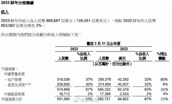 2023 财年,中国商业分部的经调整 EBITA 为人民币 1848.62 亿元,相较 2022 财年的人民币 1824.31亿元增长 1%。该增长主要是由于淘特、盒马和淘菜菜亏损收窄,部分被客户管理利润下降所抵销。