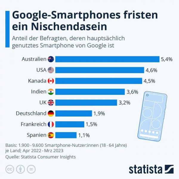 根据 Statista Consumer Insights 的最新报告,谷歌 Pixel 手机在全球市场上的份额非常低,只有少数几个国家的用户比较喜欢这款手机。其中,澳大利亚、美国和加拿大是谷歌 Pixel 手机最受欢迎的国家,市场份额分别为 5.4%、4.6% 和 4.5%。而在印度、英国、德国、法国和西班牙等国家,谷歌 Pixel 手机的市场份额则不足 3%。